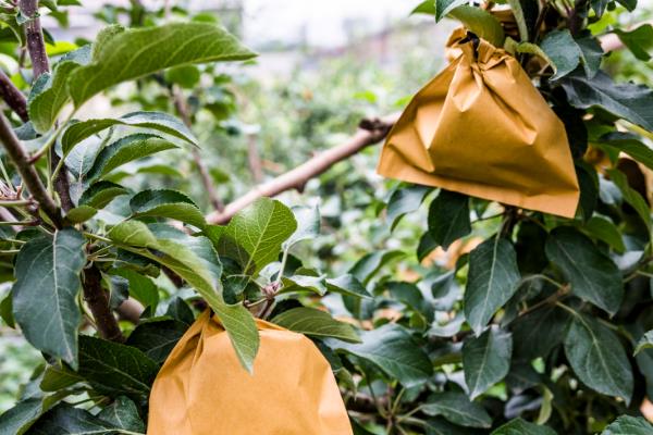2、注意事项:下过大雨之后(尤其是阴雨连绵的天气)为降低果实发生黑点病的几率,可将纸袋下部的两角分别斜剪一下,以便透气、散湿;套袋内有积水时应及时开口放水。